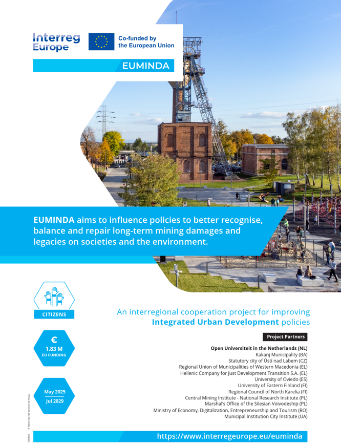 Περισσότερες από 50 περιοχές εξόρυξης άνθρακα στην Ευρώπη είναι σήμερα κατανεμημένες σε 17 χώρες. Ωστόσο, ως μέρος της επιταχυνόμενης ενεργειακής μετάβασης της ΕΕ, η εξόρυξη πρώτων υλών καταργείται, οδηγώντας σε πολλά ενεργά, εγκαταλελειμμένα ή επαναχρησιμοποιημένα ορυχεία με μακροπρόθεσμες φυσικές και κοινωνικές συνέπειες, αναπάντητα ερωτήματα ευθύνης και αφήνοντας πίσω κοινότητες. Το EUMINDA στοχεύει να επηρεάσει τις πολιτικές που συμβάλλουν στην αρχή της δίκαιης μετάβασης για την καλύτερη αναγνώριση, εξισορρόπηση και επιδιόρθωση μακροπρόθεσμων ζημιών και κληρονομιών εξόρυξης (MDL) στις κοινωνίες και το περιβάλλον. Τα MDL ορίζονται σε τρία θέματα διατομεακής πρόκλησης – νομικές πτυχές, κοινωνικοοικονομικές ανησυχίες και βιωσιμότητα – που αντιπροσωπεύουν το παρελθόν, το παρόν ή/και τις προγραμματισμένες δραστηριότητες του χρονοδιαγράμματος μετάβασης στην εξόρυξη. Το EUMINDA συγκεντρώνει 12 εταίρους έργου (συμπεριλαμβανομένου ενός εταίρου ανακάλυψης), 3 Συνδεδεμένες Αρχές Πολιτικής που εκπροσωπούν 9 χώρες (συμπεριλαμβανομένων 2 υποψηφίων για την ΕΕ) και 8 μέσα πολιτικής. Οι επιλεγμένες περιοχές βρίσκονται σε διαφορετικά στάδια του κύκλου εξόρυξης και διαθέτουν συμπληρωματικούς πόρους. Το έργο θα προωθήσει τη διαπεριφερειακή συνεργασία σε προσεγγίσεις πολιτικής για τη βελτίωση των θεσμικών πλαισίων που ασχολούνται με τις μακροπρόθεσμες MDL μέσω της οικοδόμησης ικανοτήτων σχετικών οργανισμών και φορέων χάραξης πολιτικής και της συμμετοχής πολιτών και ενδιαφερομένων στη σταδιακή κατάργηση, συνέχιση ή βιώσιμη επαναχρησιμοποίηση των τοποθεσιών εξόρυξης. Η Βασική Φάση του EUMINDA έχει δημιουργηθεί ως 1) ανάλυση κατάστασης, 2) ανάπτυξη ικανοτήτων χωρίς αποκλεισμούς από τα ενδιαφερόμενα μέρη και 3) βελτίωση πολιτικής. Επιπλέον, οι εταίροι μπορούν να αναπτύξουν μια ευέλικτη μέθοδο ανάλυσης δεδομένων για την ανίχνευση αιτιωδών σχέσεων μεταξύ των δραστηριοτήτων εξόρυξης και των ζημιών μέσω ενός πιθανού πιλοτικού προγράμματος (που θα αποφασιστεί και θα εφαρμοστεί μεσοπρόθεσμα).